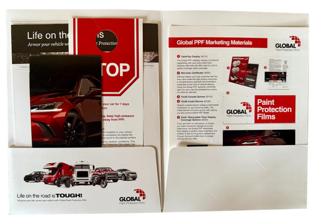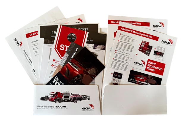 Ready-made presentation folder consisting of eye-catching Global PPF marketing materials. Perfect for presenting Global PPF to car dealerships.